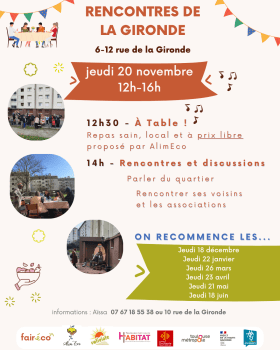 Organisé pour les habitants par des associations du quartier de Bagatelle, les Rencontres de la Gironde sont portées par les associations fairéco, AlimEco, soutenues par Toulouse Métropole Habitat. Elles ont lieu une fois par mois et permettent aux habitants de se rencontrer et de découvrir les associations du quartier qui peuvent leur être utiles.