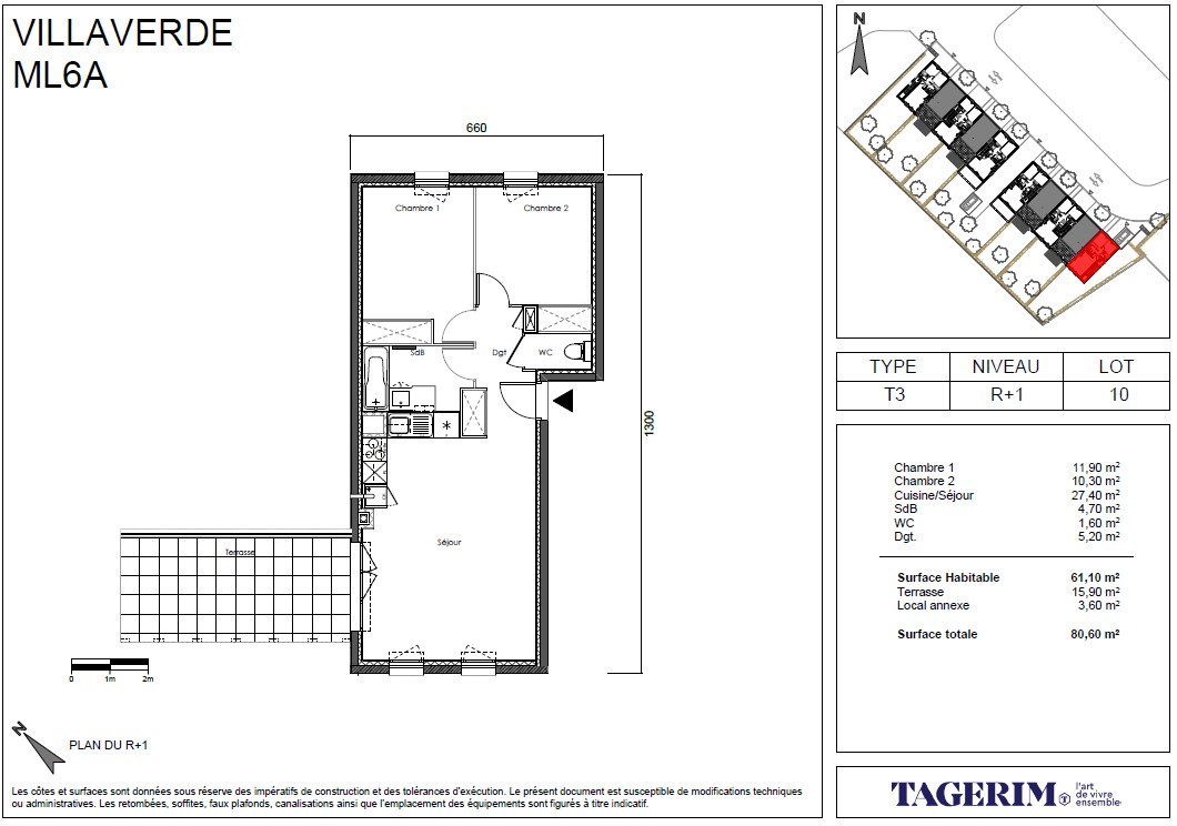 Découvrez ce agréable T3 de 61,10 m², situé au 1er étage de la résidence VILLA VERDE à Seilh. Ce logement lumineux offre une belle pièce de vie avec cuisine/séjour de 27,40 m², deux chambres confortables, une salle de bains, un WC séparé ainsi qu'une grande terrasse de 15,90 m² et un local annexe de 3,60 m².Le logement comprend :