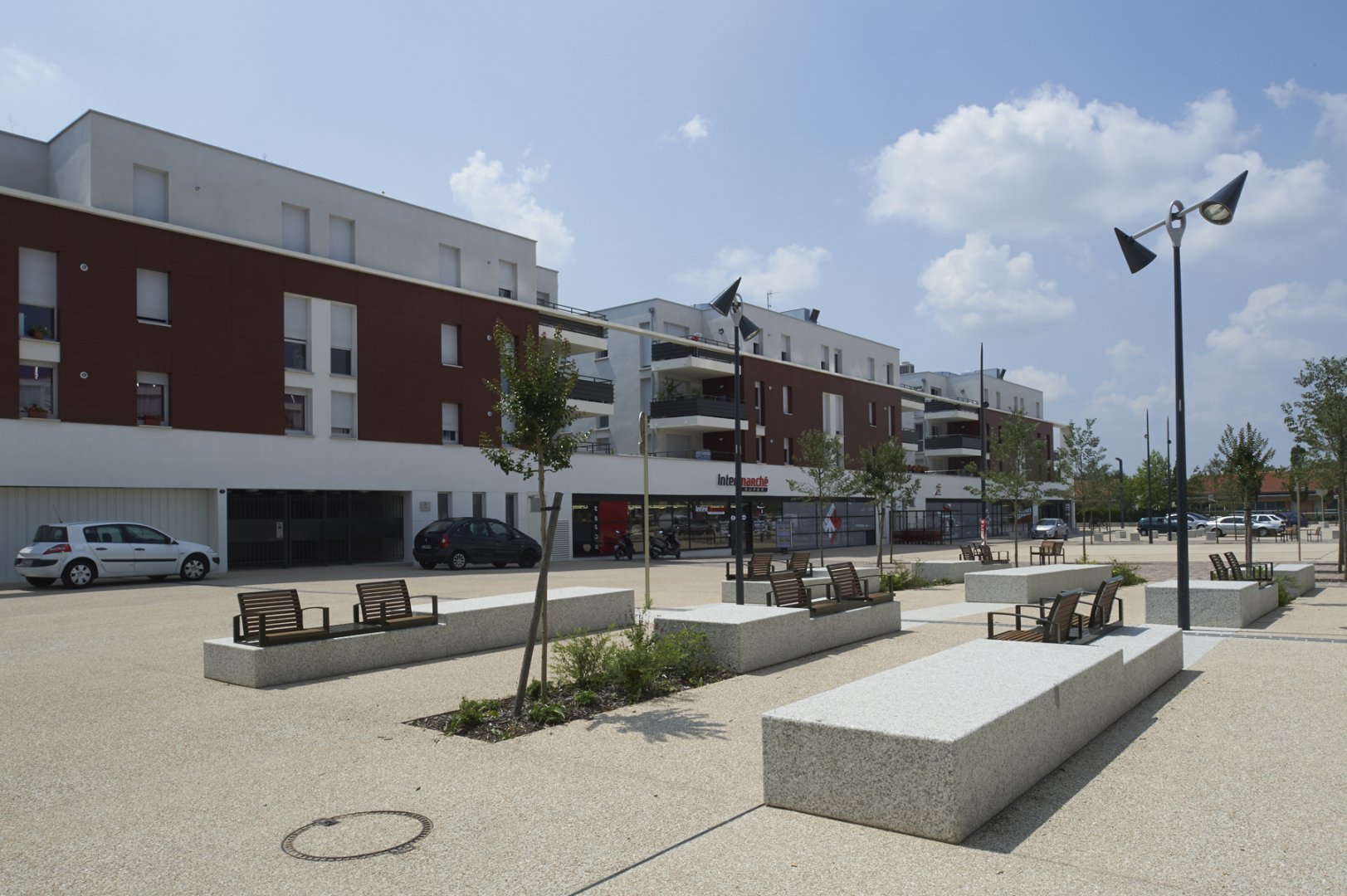 Faisant face à une place animée, véritable centre de vie du quartier, elle abrite également derrière ses façades des espaces verts.